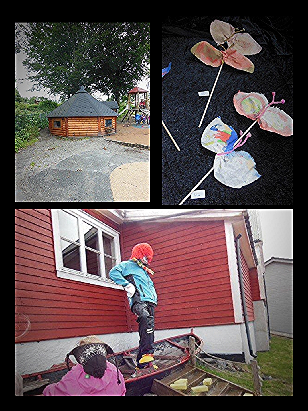 Vi liker godt å være ute! Vi går også på turer i nærområdet. Vi har ballbinge like ved, det samme med Gneist-fotballbanen. Vi har Lilandstoppen med utsikt over Flesland, lekeplassen og fiskedammen ved Liland skole er steder vi ofte drar til. Skal vi på lengre turer og utflukter har vi 2 barnehagebusser disponible, då reiser vi til Arboretet, Japanhagen, Skageskogen m.m.